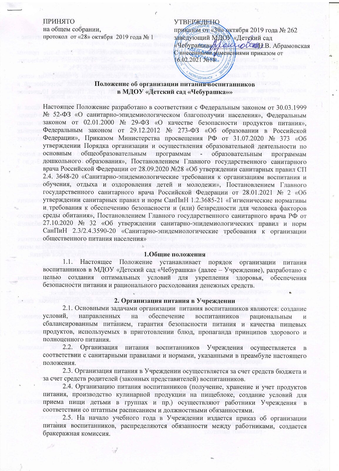 Положение об организации питания воспитанников в МДОУ "Детский сад "Чебурашка"